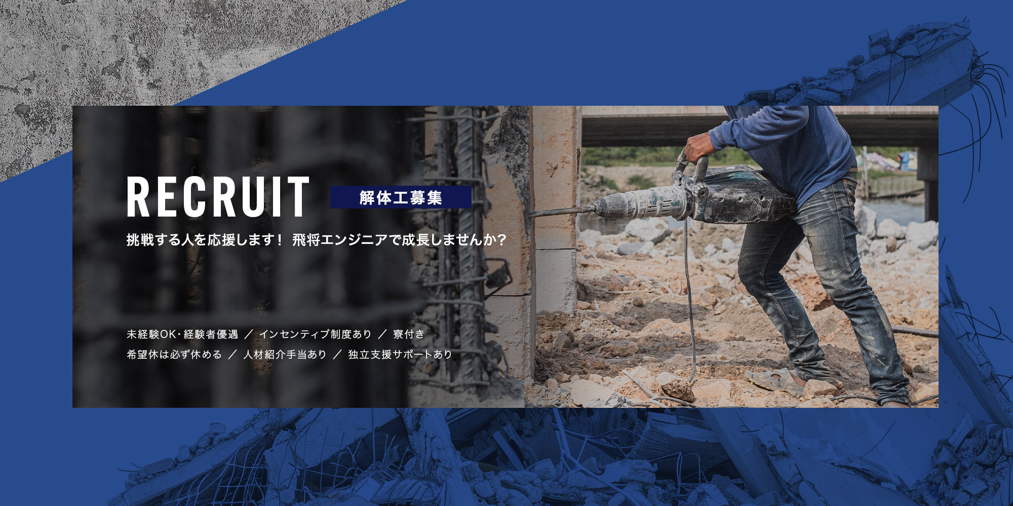解体工事の職人として専門性を高め、未経験からでも環境が整っております。もちろん、経験者の方にとっても、たくさんの学びや経験が得られる機会が多いです。私たちは目標に向かい、挑戦するアナタを全力でサポートいたします。ご興味がありましたら、ぜひご応募ください。